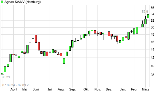 Mit dem Anstieg auf 53,80 EUR hat die Ageas-Aktie (ISIN BE0974264930) am 06.03.2025 ein neues 5-Jahres-Hoch erreicht und damit den Kurs vom 01.06.2021 eingestellt.