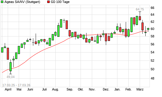 Mit dem Anstieg auf 59,80 EUR hat die Ageas-Aktie am 16.03.2026 die 100-Tage-Linie nach oben gekreuzt.