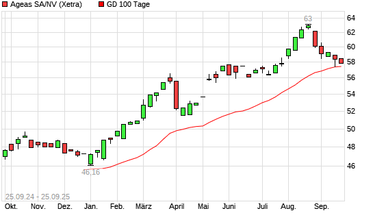 Mit dem Rücksetzer auf 57,85 EUR hat die Ageas-Aktie am 24.09.2025 die 100-Tage-Linie nach unten gekreuzt.