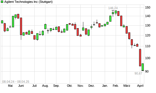 Mit dem Rücksetzer auf 91,92 EUR hat die Agilent Technologies-Aktie (ISIN US00846U1016) am 07.04.2025 ein neues 3-Jahres-Tief erreicht und damit den Kurs vom 31.10.2023 eingestellt.