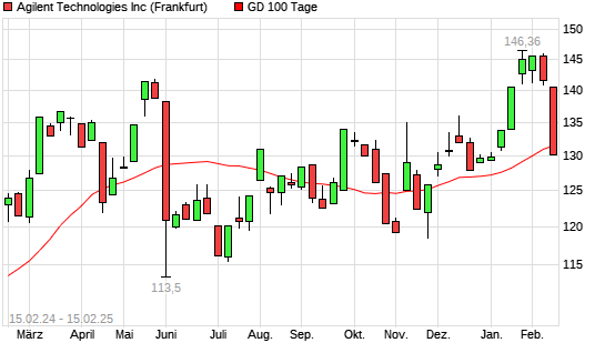 Mit dem Rücksetzer auf 130,22 EUR hat die Agilent Technologies-Aktie am 14.02.2025 die 100-Tage-Linie nach unten gekreuzt.