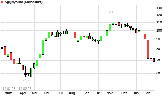 Mit dem Rücksetzer auf 67,50 EUR hat die Agilysys-Aktie (ISIN US00847J1051) am 13.02.2026 ein neues 6-Monats-Tief erreicht und damit den Kurs vom 29.01.2026 eingestellt.