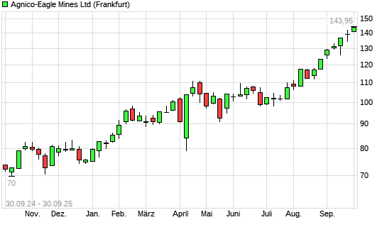 Mit dem Anstieg auf 142,90 EUR hat die Agnico-Eagle Mines-Aktie (ISIN CA0084741085) am 29.09.2025 ein neues All-Time-High erreicht und damit den Kurs vom 26.09.2025 eingestellt.