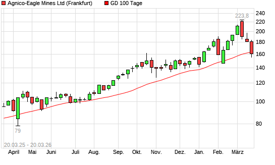 Mit dem Rücksetzer auf 159,05 EUR hat die Agnico-Eagle Mines-Aktie am 19.03.2026 die 100-Tage-Linie nach unten gekreuzt.