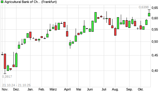 Mit dem Anstieg auf 0,64 EUR hat die Agricultural Bank of China-Aktie (ISIN CNE100000Q43) am 20.10.2025 ein neues All-Time-High erreicht und damit den Kurs vom 13.06.2025 eingestellt.