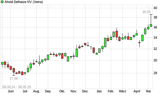 Mit dem Anstieg auf 37,90 EUR hat die Ahold Delhaize-Aktie (ISIN NL0011794037) am 07.05.2025 ein neues All-Time-High erreicht und damit den Kurs vom 06.05.2025 eingestellt.