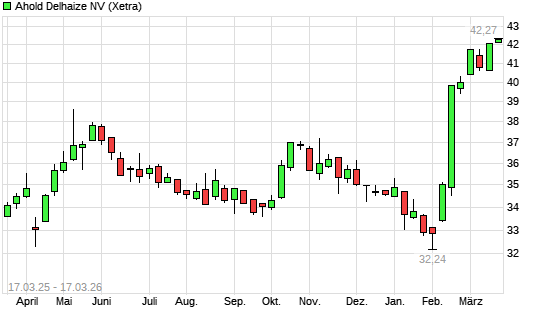 Mit dem Anstieg auf 42,24 EUR hat die Ahold Delhaize-Aktie (ISIN NL0011794037) am 16.03.2026 ein neues All-Time-High erreicht und damit den Kurs vom 13.03.2026 eingestellt.