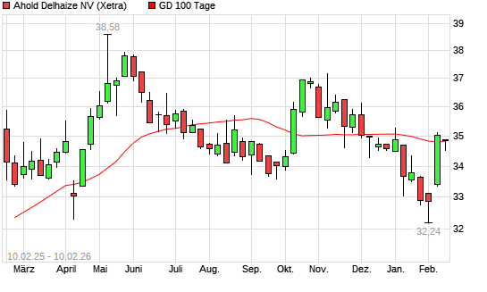 Mit dem Rücksetzer auf 34,51 EUR hat die Ahold Delhaize-Aktie am 09.02.2026 die 100-Tage-Linie nach unten gekreuzt.