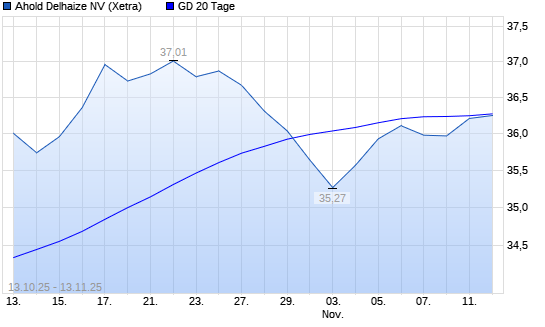 Mit dem Rücksetzer auf 36,24 EUR hat die Ahold Delhaize-Aktie am 12.11.2025 die 20-Tage-Linie nach unten gekreuzt.