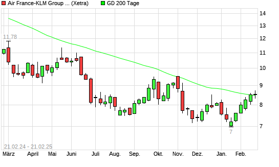 Mit dem Rücksetzer auf 8,31 EUR hat die Air France-KLM-Aktie am 20.02.2025 die 200-Tage-Linie nach unten gekreuzt.