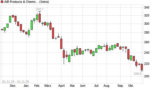 Mit dem Rücksetzer auf 209,50 EUR hat die Air Products & Chemicals-Aktie (ISIN US0091581068) am 31.10.2025 ein neues 12-Monats-Tief erreicht und damit den Kurs vom 30.10.2025 eingestellt.