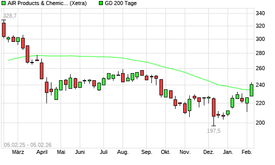 Mit dem Anstieg auf 234,60 EUR hat die Air Products & Chemicals-Aktie am 04.02.2026 die 200-Tage-Linie nach oben gekreuzt.