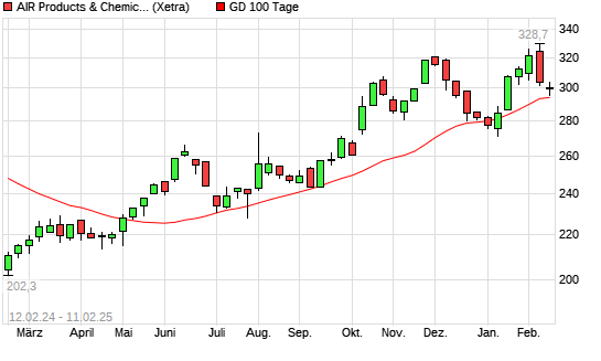 Mit dem Rücksetzer auf 294,60 EUR hat die Air Products & Chemicals-Aktie am 10.02.2025 die 100-Tage-Linie nach unten gekreuzt.