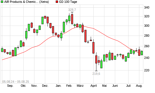 Mit dem Rücksetzer auf 243,30 EUR hat die Air Products & Chemicals-Aktie am 04.08.2025 die 100-Tage-Linie nach unten gekreuzt.