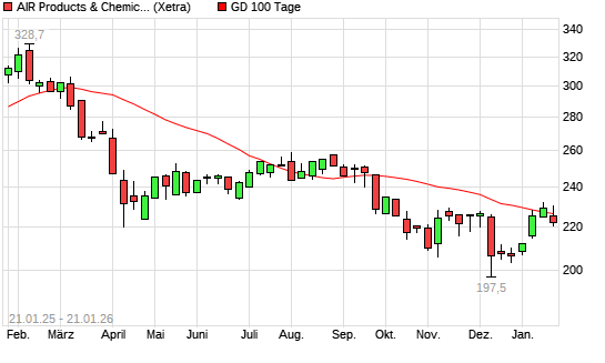 Mit dem Rücksetzer auf 219,20 EUR hat die Air Products & Chemicals-Aktie am 20.01.2026 die 100-Tage-Linie nach unten gekreuzt.