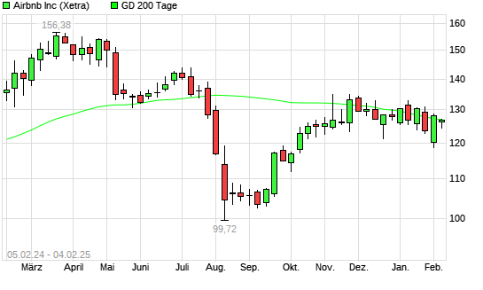 Mit dem Rücksetzer auf 123,88 EUR hat die Airbnb-Aktie am 03.02.2025 die 200-Tage-Linie nach unten gekreuzt.
