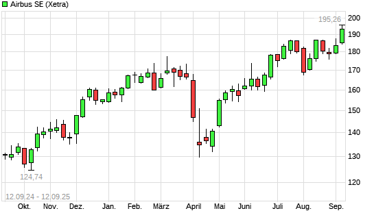 Mit dem Anstieg auf 194,86 EUR hat die Airbus-Aktie (ISIN NL0000235190) am 11.09.2025 ein neues All-Time-High erreicht und damit den Kurs vom 10.09.2025 eingestellt.