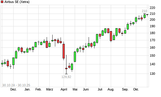 Mit dem Anstieg auf 211,80 EUR hat die Airbus-Aktie (ISIN NL0000235190) am 29.10.2025 ein neues All-Time-High erreicht und damit den Kurs vom 23.10.2025 eingestellt.