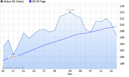 Mit dem Rücksetzer auf 205,70 EUR hat die Airbus-Aktie am 14.11.2025 die 20-Tage-Linie nach unten gekreuzt.