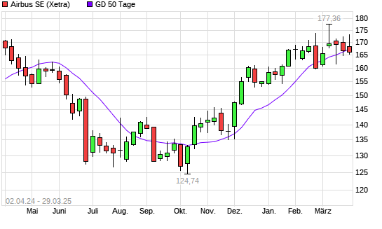Mit dem Rücksetzer auf 165,92 EUR hat die Airbus-Aktie am 28.03.2025 die 50-Tage-Linie nach unten gekreuzt.