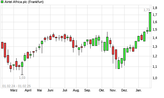 Mit dem Anstieg auf 1,73 EUR hat die Airtel Africa-Aktie (ISIN GB00BKDRYJ47) am 31.01.2025 ein neues 12-Monats-Hoch erreicht und damit den Kurs vom 29.01.2025 eingestellt.