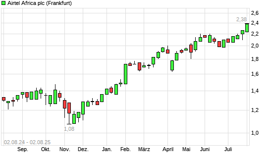 Mit dem Anstieg auf 2,38 EUR hat die Airtel Africa-Aktie (ISIN GB00BKDRYJ47) am 01.08.2025 ein neues All-Time-High erreicht und damit den Kurs vom 31.07.2025 eingestellt.