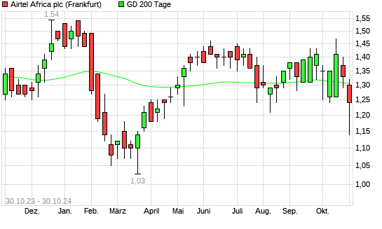 Mit dem Rücksetzer auf 1,25 EUR hat die Airtel Africa-Aktie am 29.10.2024 die 200-Tage-Linie nach unten gekreuzt.