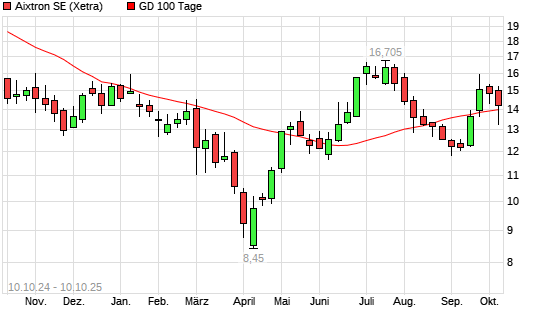 Mit dem Anstieg auf 14,23 EUR hat die Aixtron-Aktie am 09.10.2025 die 100-Tage-Linie nach oben gekreuzt.