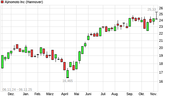 Mit dem Anstieg auf 24,91 EUR hat die Ajinomoto-Aktie (ISIN JP3119600009) am 05.11.2025 ein neues All-Time-High erreicht und damit den Kurs vom 04.11.2025 eingestellt.
