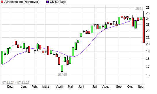 Mit dem Rücksetzer auf 23,27 EUR hat die Ajinomoto-Aktie am 06.11.2025 die 50-Tage-Linie nach unten gekreuzt.