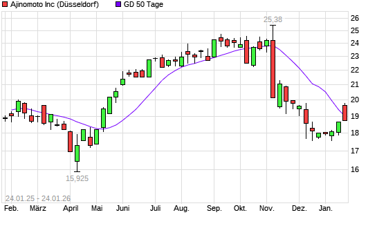 Mit dem Rücksetzer auf 18,54 EUR hat die Ajinomoto-Aktie am 23.01.2026 die 50-Tage-Linie nach unten gekreuzt.