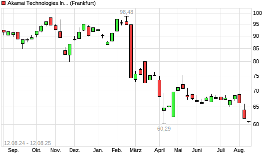 Mit dem Rücksetzer auf 60,79 EUR hat die Akamai Technologies-Aktie (ISIN US00971T1016) am 11.08.2025 ein neues 5-Jahres-Tief erreicht und damit den Kurs vom 08.08.2025 eingestellt.