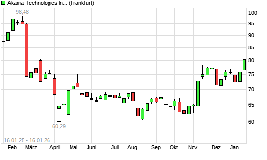 Mit dem Anstieg auf 78,57 EUR hat die Akamai Technologies-Aktie (ISIN US00971T1016) am 15.01.2026 ein neues 6-Monats-Hoch erreicht und damit den Kurs vom 25.11.2025 eingestellt.