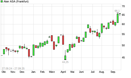 Mit dem Anstieg auf 65,80 EUR hat die Aker ASA-Aktie (ISIN NO0010234552) am 26.09.2025 ein neues 12-Monats-Hoch erreicht und damit den Kurs vom 25.09.2025 eingestellt.