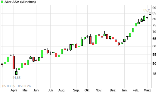 Mit dem Anstieg auf 84,00 EUR hat die Aker ASA-Aktie (ISIN NO0010234552) am 04.03.2026 ein neues 3-Jahres-Hoch erreicht und damit den Kurs vom 18.02.2026 eingestellt.Die Aker ...weiterlesen