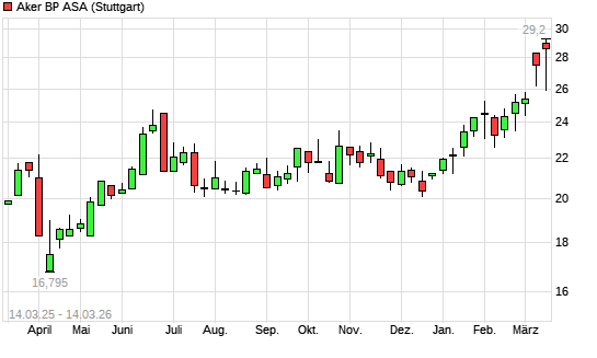 Mit dem Anstieg auf 28,50 EUR hat die Aker BP-Aktie (ISIN NO0010345853) am 13.03.2026 ein neues 3-Jahres-Hoch erreicht und damit den Kurs vom 12.03.2026 eingestellt.
