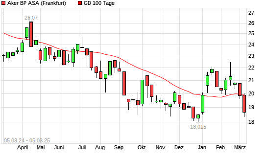 Mit dem Rücksetzer auf 18,45 EUR hat die Aker BP-Aktie am 04.03.2025 die 100-Tage-Linie nach unten gekreuzt.