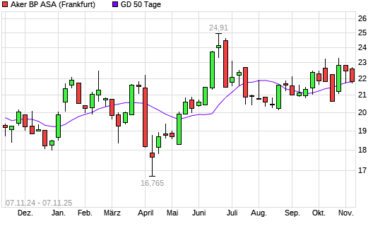 Mit dem Rücksetzer auf 21,75 EUR hat die Aker BP-Aktie am 06.11.2025 die 50-Tage-Linie nach unten gekreuzt.