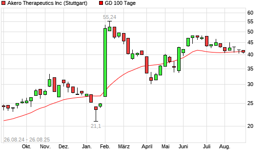 Mit dem Rücksetzer auf 40,49 EUR hat die Akero Therapeutics-Aktie am 25.08.2025 die 100-Tage-Linie nach unten gekreuzt.