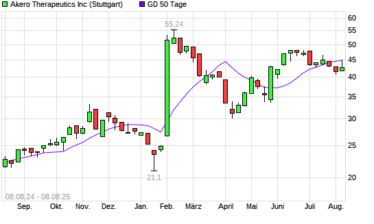 Mit dem Rücksetzer auf 43,39 EUR hat die Akero Therapeutics-Aktie am 07.08.2025 die 50-Tage-Linie nach unten gekreuzt.