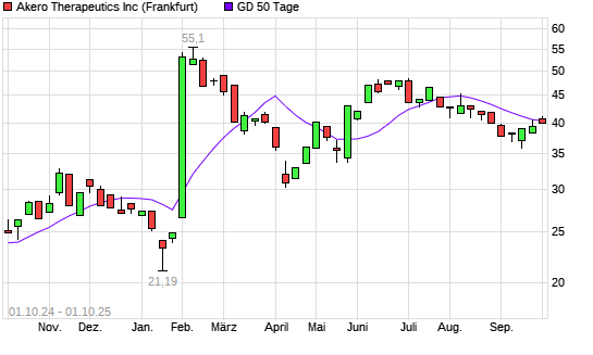 Mit dem Rücksetzer auf 40,04 EUR hat die Akero Therapeutics-Aktie am 30.09.2025 die 50-Tage-Linie nach unten gekreuzt.