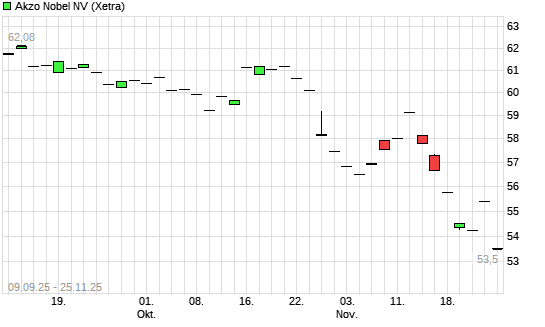 Mit dem Rücksetzer auf 53,60 EUR hat die Akzo Nobel-Aktie (ISIN NL0013267909) am 24.11.2025 ein neues 6-Monats-Tief erreicht und damit den Kurs vom 04.08.2025 eingestellt.