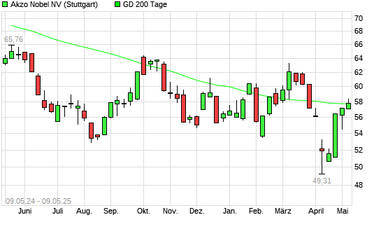 Mit dem Anstieg auf 57,60 EUR hat die Akzo Nobel-Aktie am 08.05.2025 die 200-Tage-Linie nach oben gekreuzt.