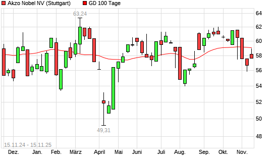 Mit dem Rücksetzer auf 58,82 EUR hat die Akzo Nobel-Aktie am 14.11.2025 die 100-Tage-Linie nach unten gekreuzt.