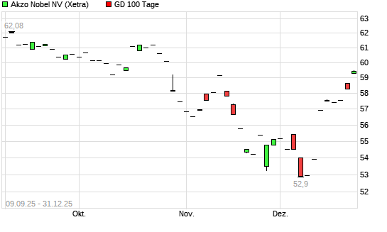 Mit dem Anstieg auf 59,12 EUR hat die Akzo Nobel-Aktie am 30.12.2025 die 100-Tage-Linie nach oben gekreuzt.Die Akzo Nobel-Aktie befindet sich seit dem 22.12.2025 im langfristigen Aufwärtstrend ...weiterlesen