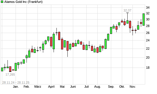 Mit dem Anstieg auf 31,84 EUR hat die Alamos Gold-Aktie (ISIN CA0115321089) am 27.11.2025 ein neues All-Time-High erreicht und damit den Kurs vom 16.10.2025 eingestellt.