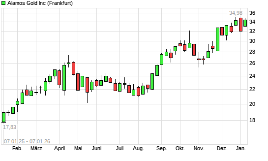 Mit dem Anstieg auf 34,79 EUR hat die Alamos Gold-Aktie (ISIN CA0115321089) am 06.01.2026 ein neues All-Time-High erreicht und damit den Kurs vom 23.12.2025 eingestellt.
