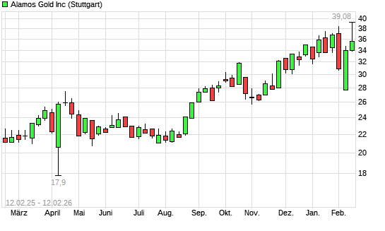 Mit dem Anstieg auf 37,93 EUR hat die Alamos Gold-Aktie (ISIN CA0115321089) am 11.02.2026 ein neues All-Time-High erreicht und damit den Kurs vom 23.01.2026 eingestellt.