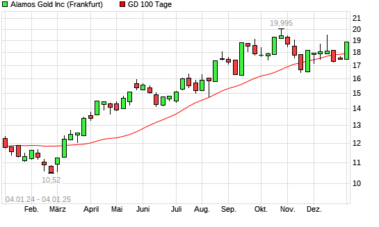 Mit dem Anstieg auf 18,90 EUR hat die Alamos Gold-Aktie am 03.01.2025 die 100-Tage-Linie nach oben gekreuzt.