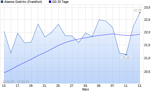 Mit dem Anstieg auf 22,21 EUR hat die Alamos Gold-Aktie am 12.03.2025 die 20-Tage-Linie nach oben gekreuzt.